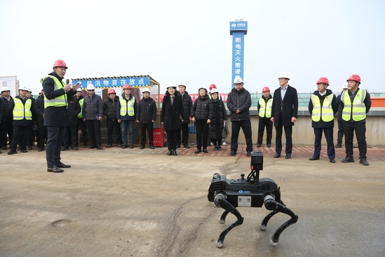 在实体展示与设备应用区,全地形智能振捣机器人、5G智能塔吊远程操控系统等智能化设备尽显科技实力。全地形振捣机器人通过参数智能调控,实现“一机多棒、人机协同”作业,既解决了传统人工振捣漏振、过振等质量问题,又规避了触电、机械伤害等安全风险,相关应用获央视等媒体报道;5G智能塔吊远程操控系统则实现群塔作业主动防碰撞、路径规划智能化,将塔司从“高空战士”变为“地面指挥官”,工效提升20%以上,推动安全管理从“人防”向“技防”转型。此外,叉车声光报警装置、新型扫地车、机器狗巡检等设备的应用,从不同维度展现了项目部“机械化换人、自动化减人、智能化无人”的科技兴安实践,有效降低作业风险、提升施工效率。观摩现场,10项特色展示内容亮点纷呈,多项创新应用获得与会人员高度认可。